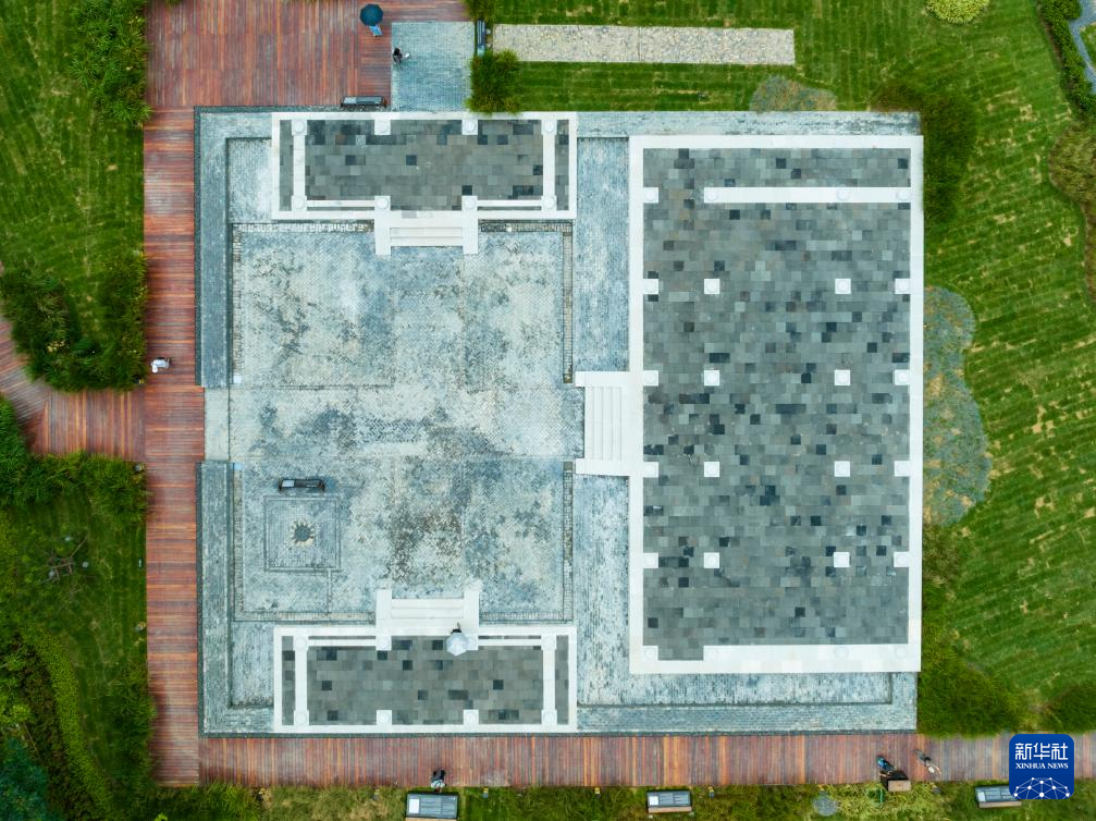 7月20日拍摄的成都东华门遗址公园外场遗址区内模拟展示的唐代庭院遗迹(无人机照片)。