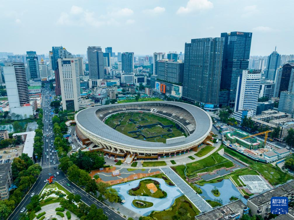 7月20日拍摄的成都东华门遗址公园外场遗址区(下)以及位于成都体育中心内的内场遗址区(无人机照片)。