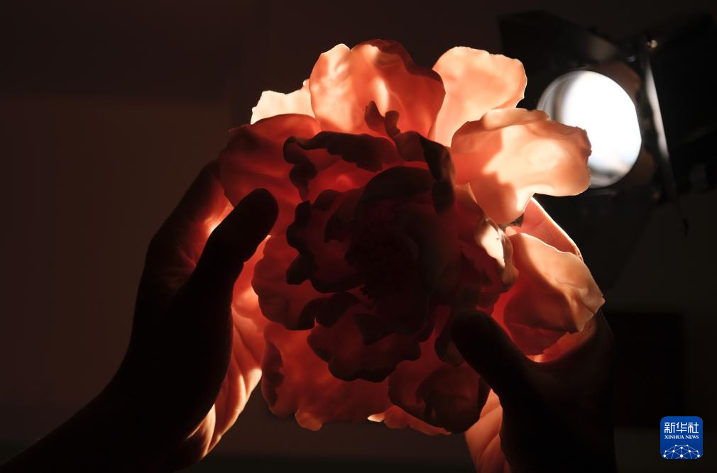 香港陶艺家王俊贤制作的陶瓷牡丹花薄似蝉翼(7月30日摄)。新华社记者 王申 摄
