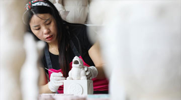 8月17日,崔凯在辽宁省营口市自己家中制作吉祥轮彩纸风车泥鼓。