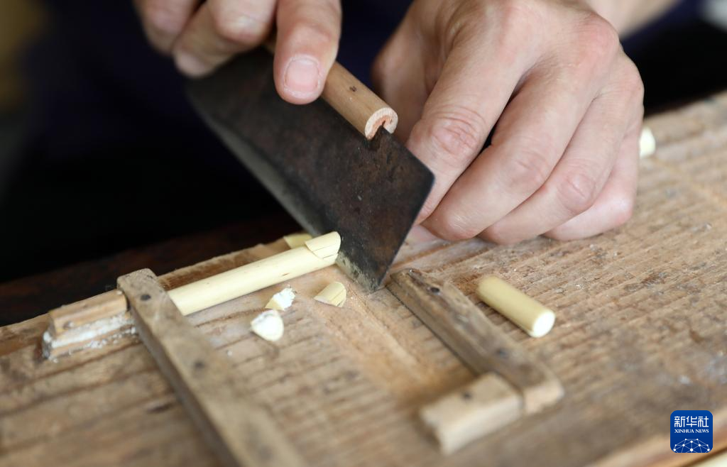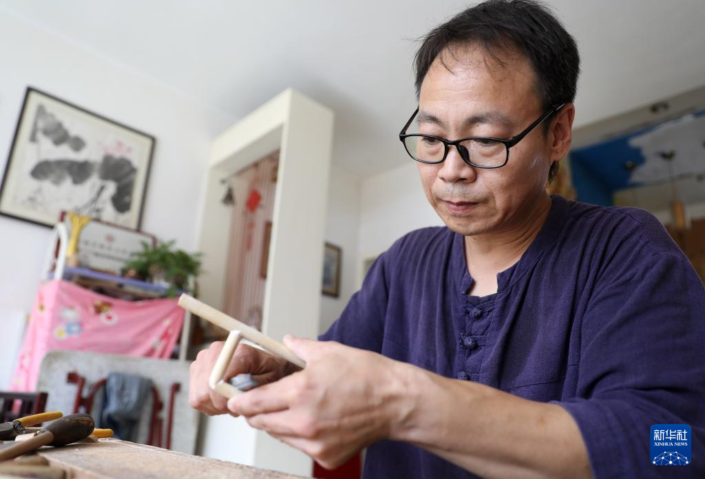 8月17日,崔凯在辽宁省营口市自己家中打磨吉祥轮彩纸风车骨架。