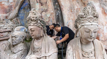 8月19日,在大足石刻宝顶山景区,工作人员对石刻造像病害进行处理。