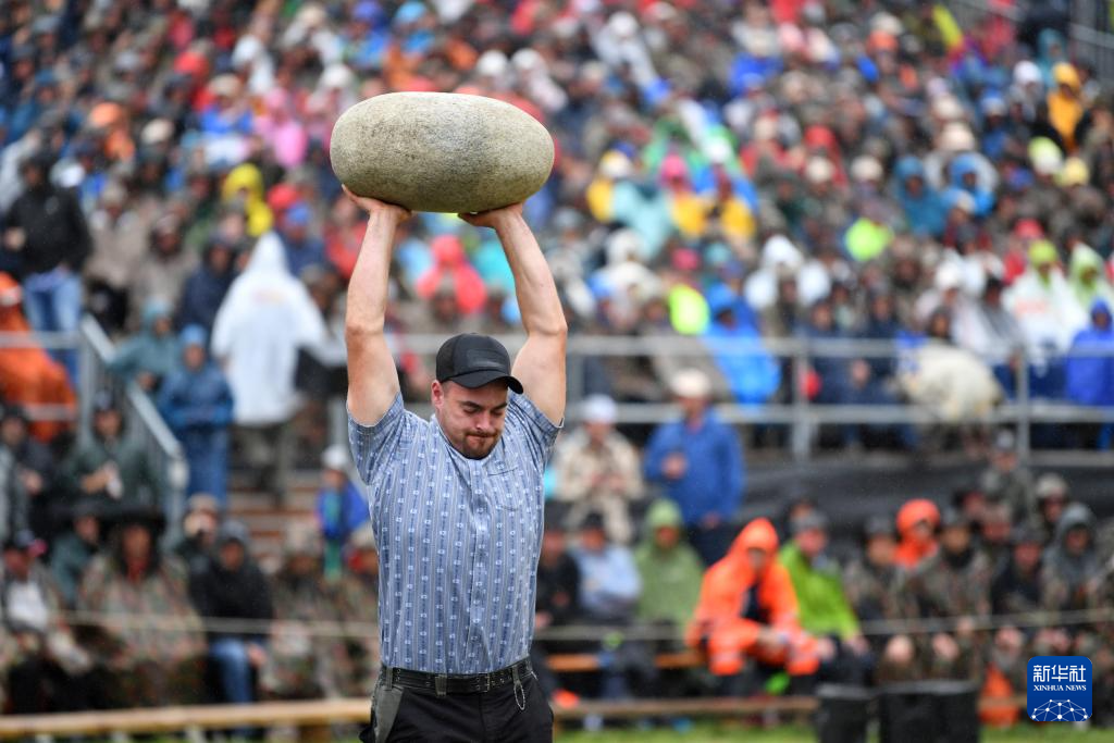 8月27日,在瑞士因特拉肯,一名男子在阿尔卑斯山牧羊人节上参加传统圆石投掷大赛。