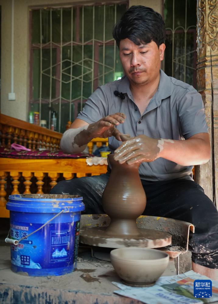 9月5日,手工艺人在英吉沙县芒辛镇恰克日库依村制作土陶。