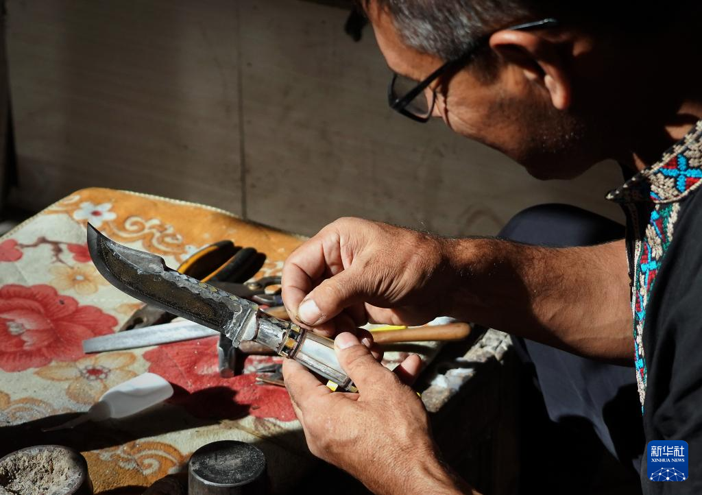 9月5日,手工艺人在英吉沙县芒辛镇喀拉巴什兰干村制作小刀。
