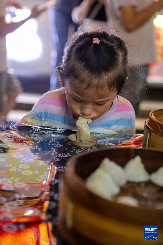 9月27日,小朋友在南翔小笼长街宴上品尝南翔小笼。