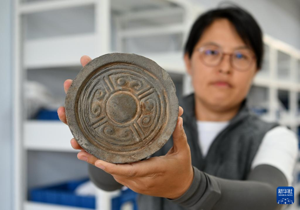 10月8日,考古队员展示柏人城遗址出土的瓦当。