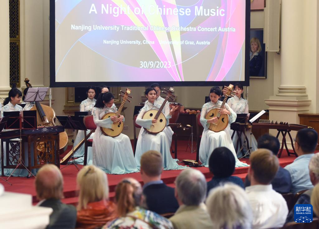 9月30日,在奥地利格拉茨,南京大学民族乐团成员在演奏《丝路驼铃》。当日,南京大学民族乐团在奥地利格拉茨举办“丝路华韵”音乐会,为现场观众带来具有浓郁中国特色的艺术盛宴,庆祝中秋佳节。