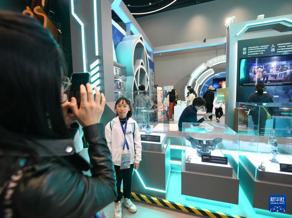 10月19日,在2023成都世界科幻大会主题展览上,参观者观看宣汉罗家坝遗址视频投影。