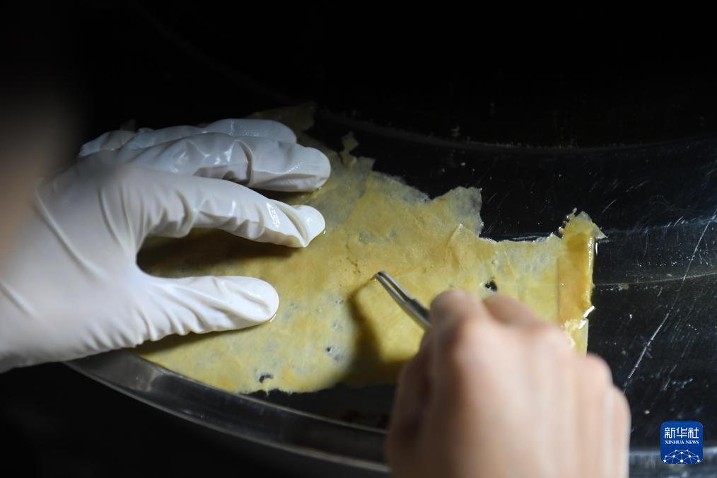 11月9日,工作人员在开化纸传统技艺工坊对修复用纸进行人工除杂。