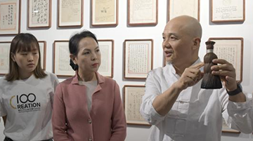 11月11日,在湖北省来凤县城龙凤文化中心广场,鼓手为跳摆手舞的舞者伴奏。