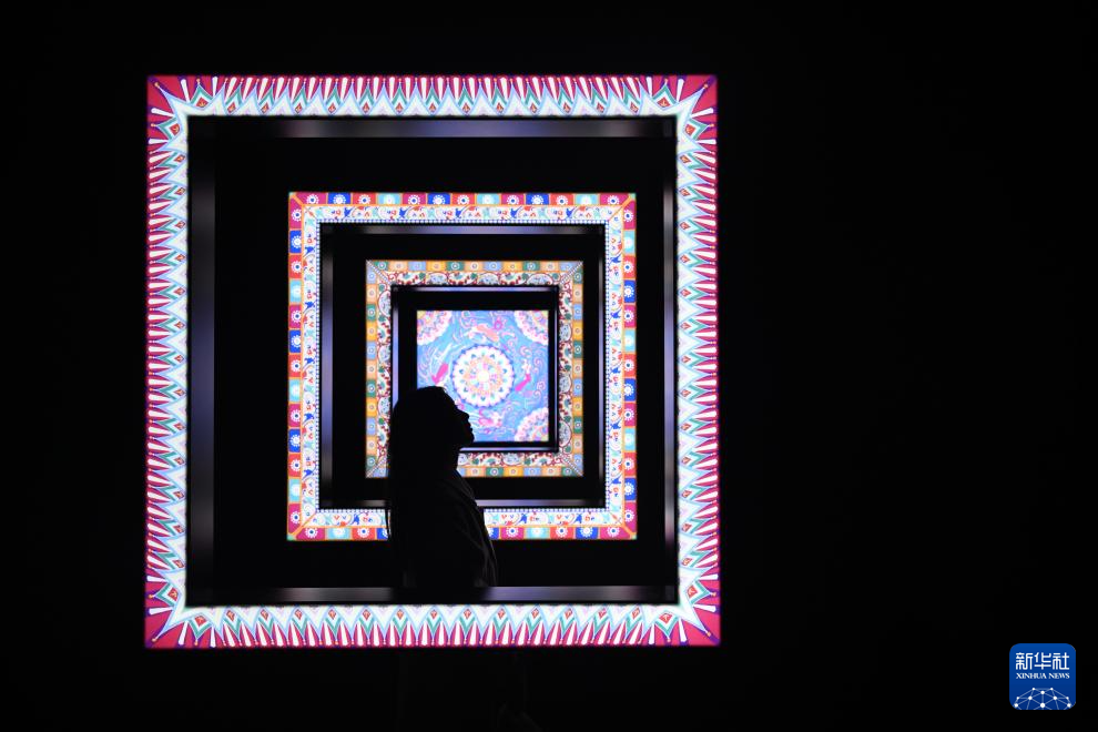 11月28日,在天津数字艺术博物馆,观众在一幅艺术家重绘的敦煌壁画作品前驻足欣赏。