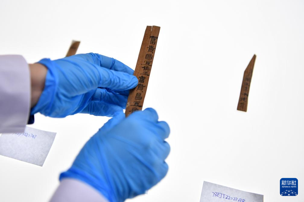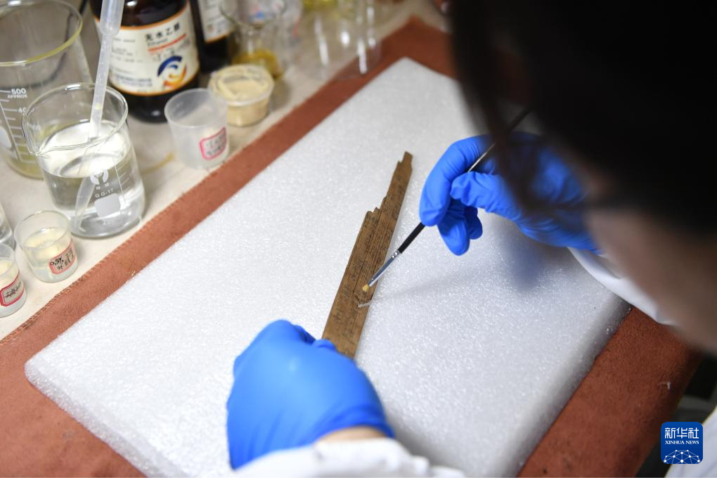甘肃文博服务中心文物修复师李媛在清理简牍上灰尘(10月26日摄)。