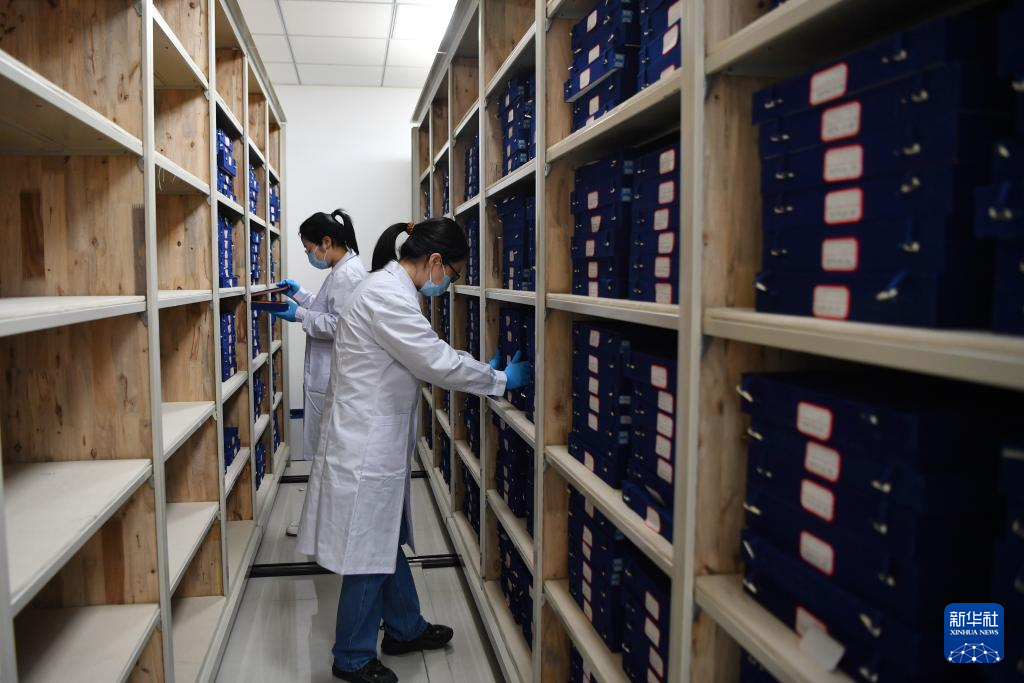 甘肃简牍博物馆科技保护部文物库房管理员杨升(右)和同事常晓丽在整理登记简牍信息(10月26日摄)。