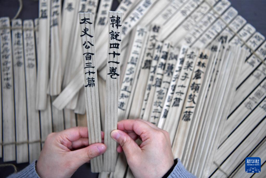 甘肃简牍博物馆工作人员在整理自己制作的简牍,准备用于博物馆的社教体验(10月25日摄)。