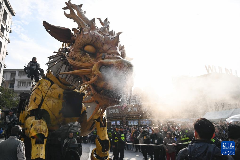 当日,大型机械装置艺术品“龙马精神”来到杭州市拱墅区武林路街区,在10余名工程师的协同操控下巡游,不时向人群喷洒水雾,吸引大批市民和游客驻足观看。
