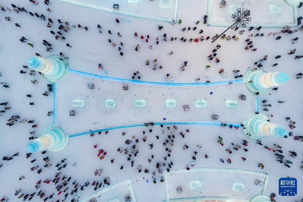 1月4日,在哈尔滨冰雪大世界园区内,游客观赏冰雕作品(无人机照片)。