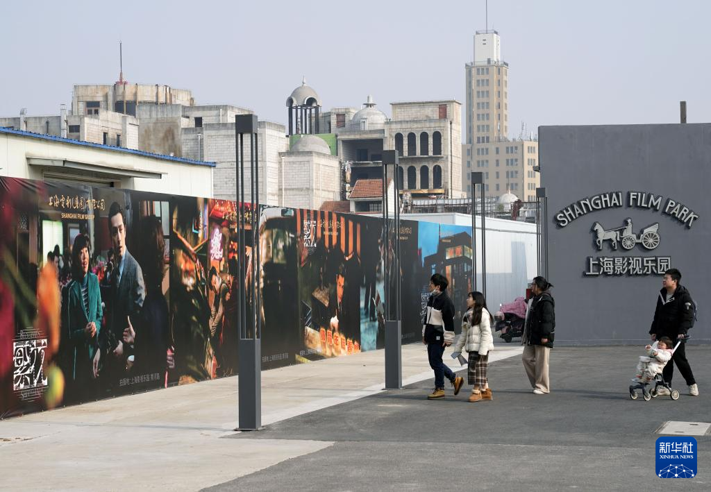 1月6日,在上海影视乐园(车墩影视基地),游客被《繁花》的海报吸引,电视剧是在此基地的实景中拍摄。
