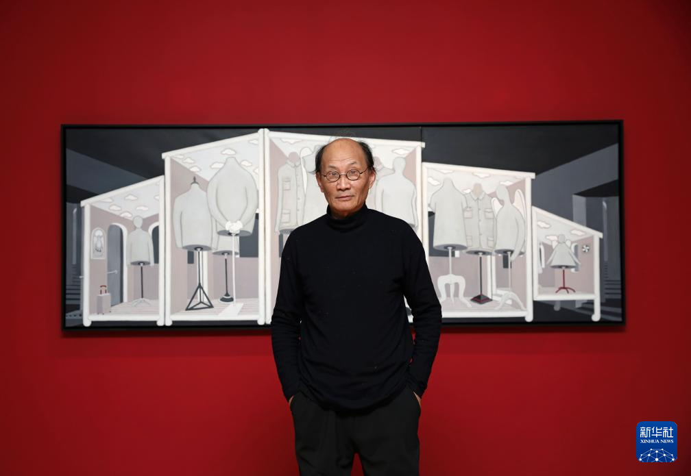 1月8日,在上海东一美术馆,作家、画家金宇澄在自己的画作《隧道》前留影。电视剧《繁花》改编自他的同名长篇小说。