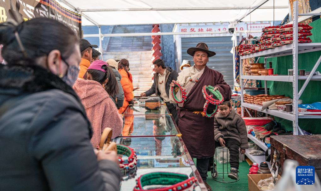 1月9日,商户在推销“巴珠”(藏族头饰)。