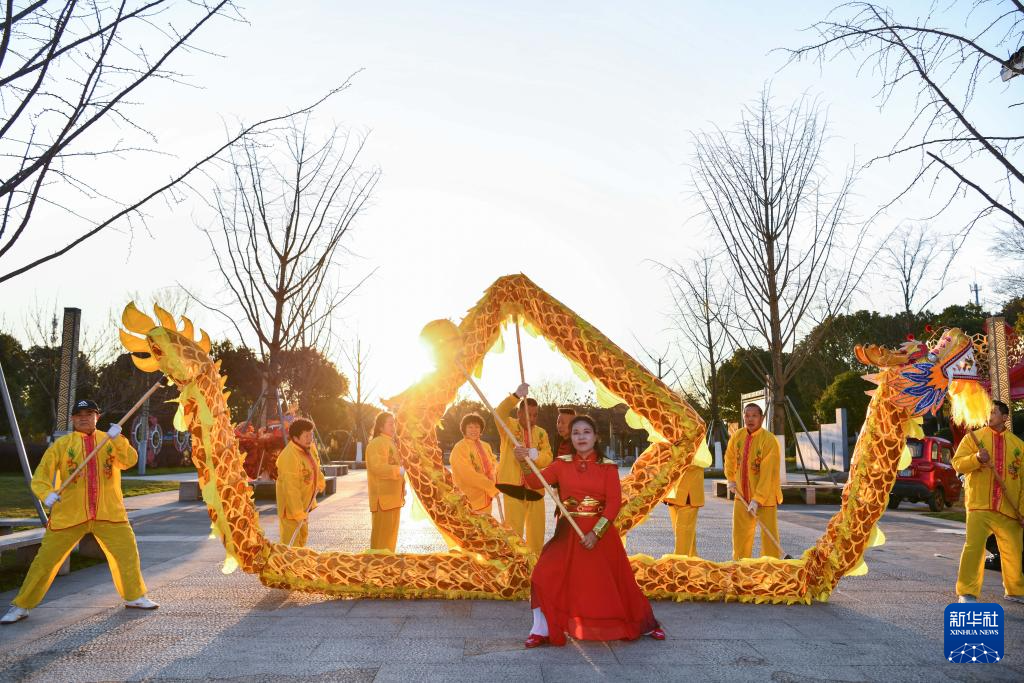 1月23日,在浙江省湖州市吴兴区织里镇利济文化公园,民间艺人在表演舞龙。