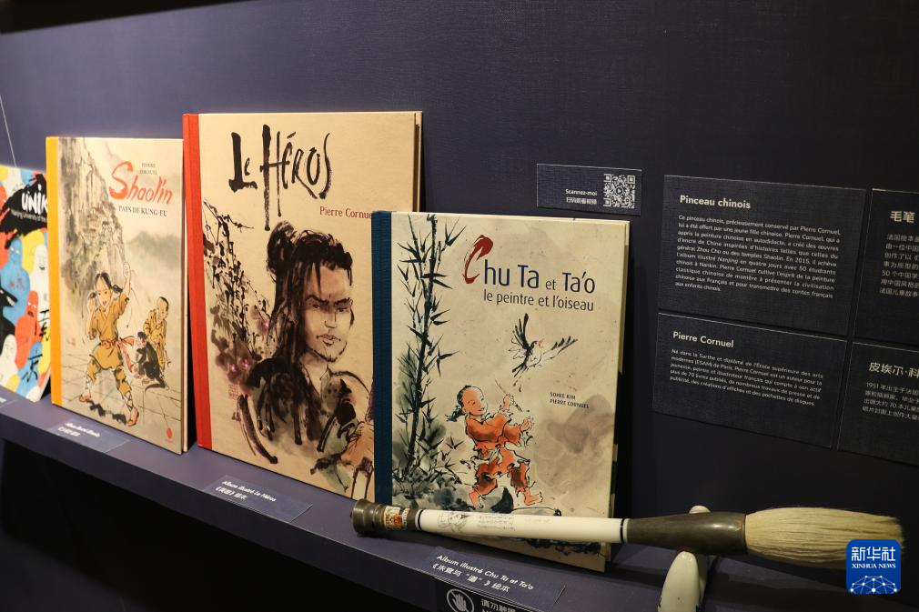 这是3月23日在法国巴黎举办的“甲子情深——中法百姓故事展”上拍摄的法国画家皮埃尔·科尼埃尔创作的“中国风”法语绘本及其在中国访问期间获赠的毛笔。
