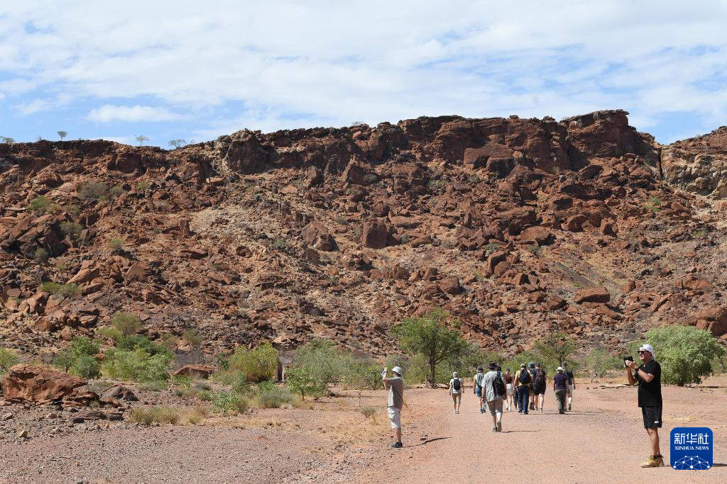 3月26日,在纳米比亚库内内省,游客参观颓废方丹岩画遗址。