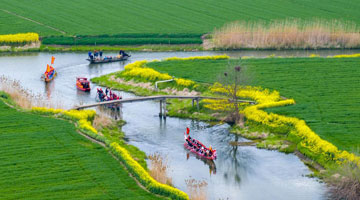 4月9日,在广西柳州市融安县实验小学,学生在跳竹竿舞。