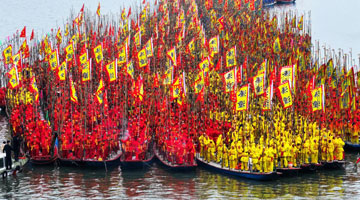 4月9日,在广西河池市罗城仫佬族自治县成龙湖广场,民间艺人在表演“上刀山”技艺。
