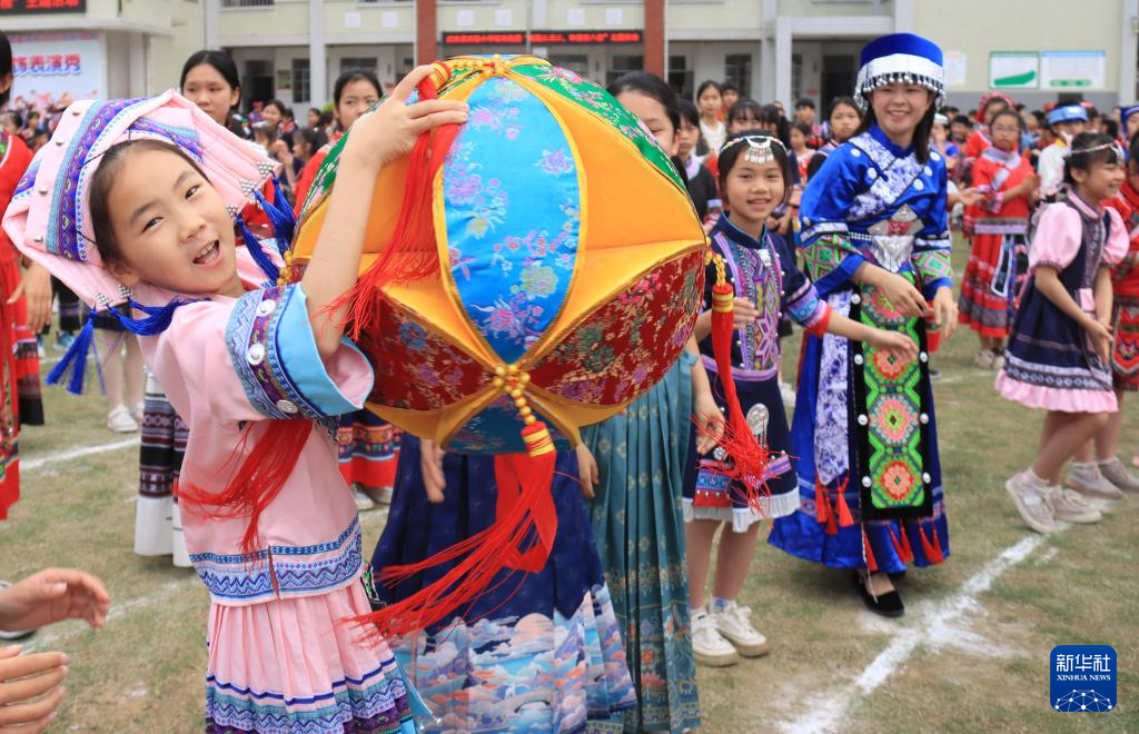 4月9日,在广西武宣县实验小学城南校区,师生在传递绣球。
