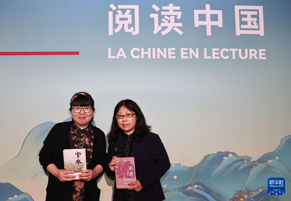 4月14日,在法国巴黎举行的2024巴黎书展上,中国作家乔叶(左)、叶弥分别携其作品《宝水》《不老》亮相书展。