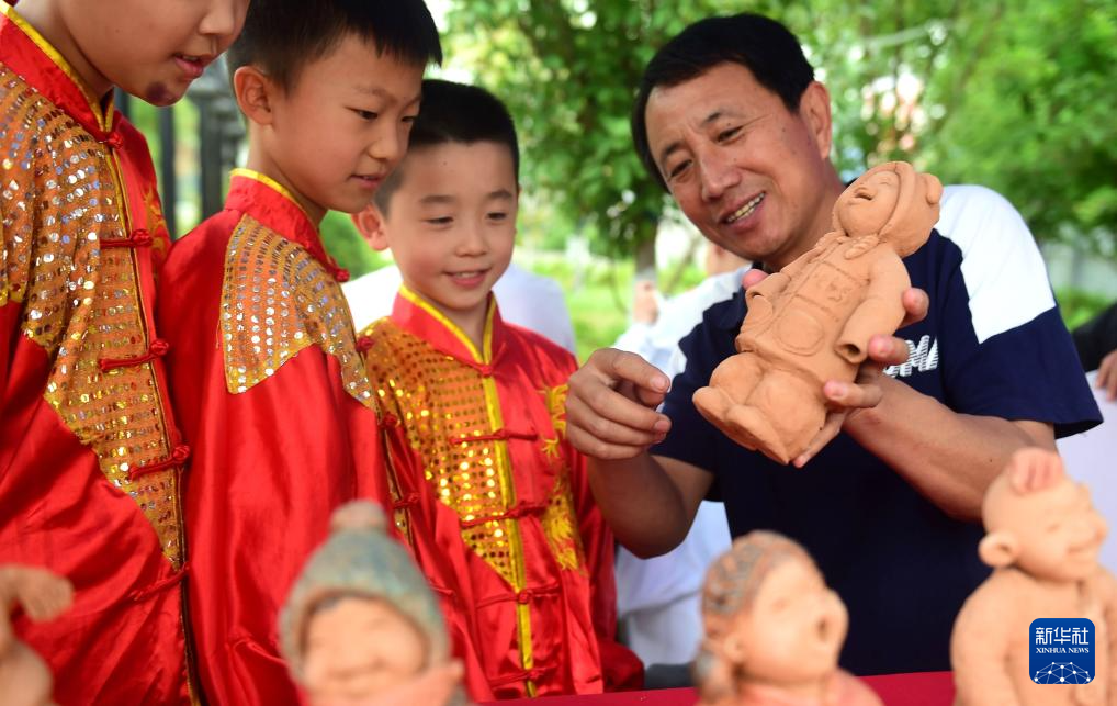 6月2日,来自沧州东光县的泥塑艺人向参观者介绍“观州泥塑”作品。