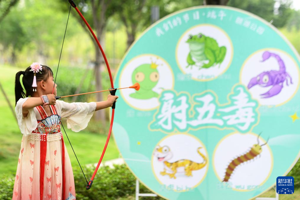6月8日,在武汉市颐湖公园举行的“我们的节日·端午”活动中,一名小朋友体验“射五毒”。