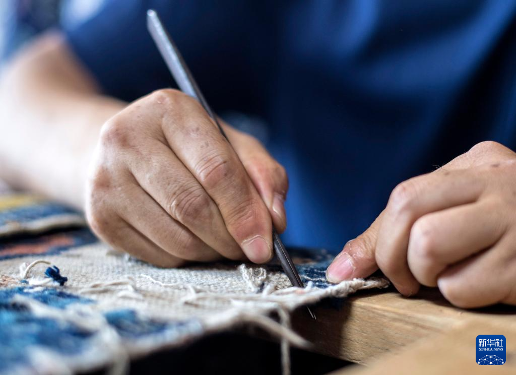 冀豫在位于河南南阳的宫毯生产基地内用古法编织宫毯(资料照片)。