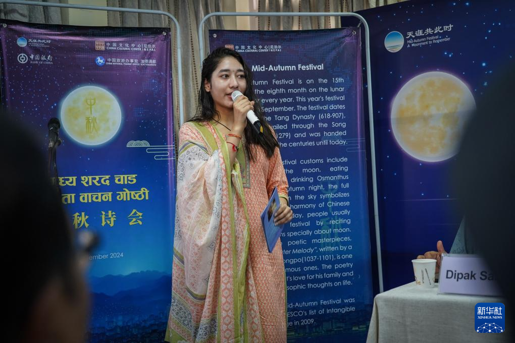 9月17日,在尼泊尔首都加德满都,一名女子在“天涯共此时——中秋诗会”上朗诵诗歌。新华社发(哈里·马哈尔詹摄)