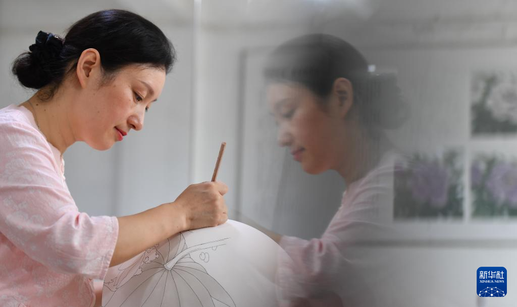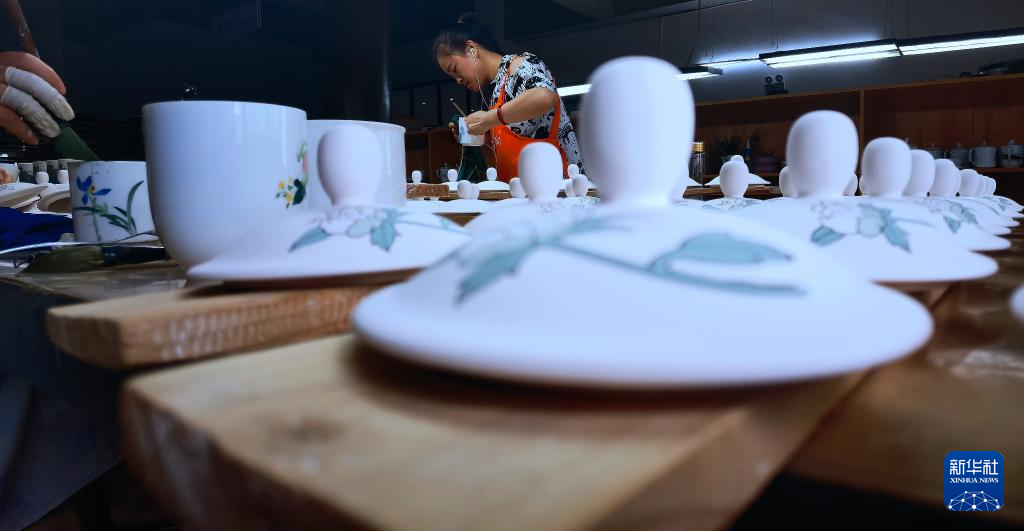 9月27日,醴陵釉下五彩瓷烧制技艺省级非遗代表性传承人申彬在制作陶瓷彩绘。