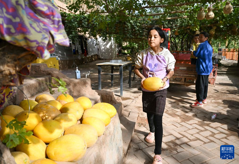 在新疆鄯善县吐峪沟乡吐峪沟村,四年级学生帕提古丽·阿不力提甫(左)在家中帮忙摆放哈密瓜,迎接游客(10月7日摄)。