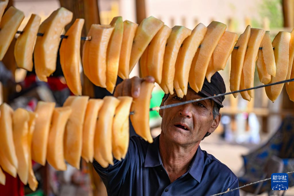 村民在吐峪沟内晾晒哈密瓜干(10月7日摄)。