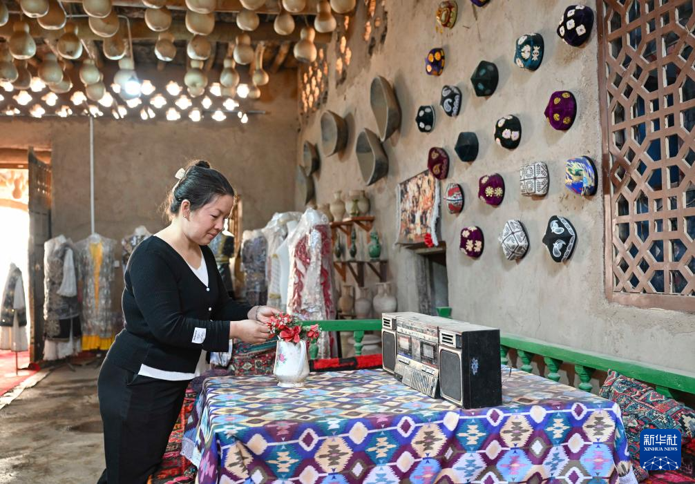 在新疆鄯善县吐峪沟乡吐峪沟村,村民艾力买·吾斯曼在家中整理摆件,准备迎接游客(10月8日摄)。