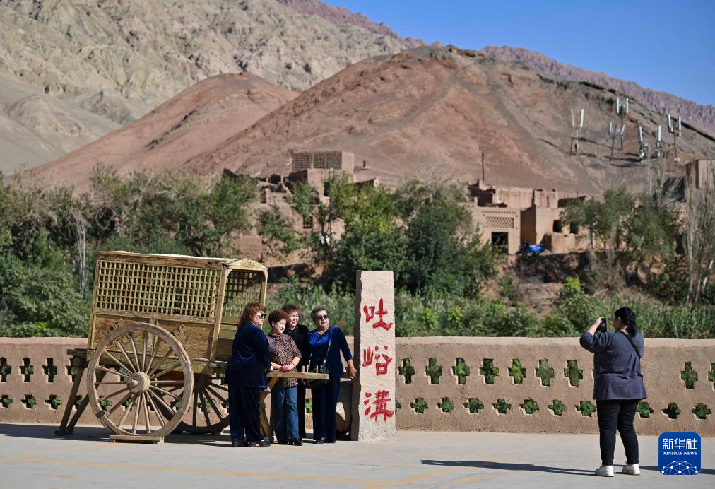 游客在新疆鄯善县吐峪沟乡吐峪沟村合影(10月6日摄)。