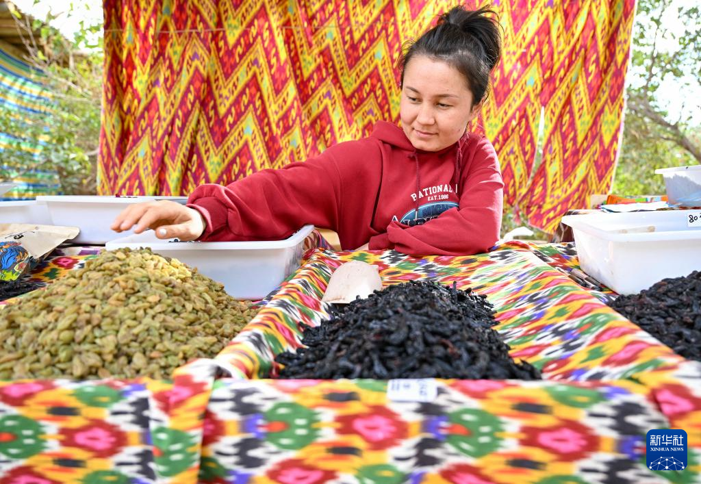 村民在吐峪沟景区内售卖葡萄干(10月8日摄)。
