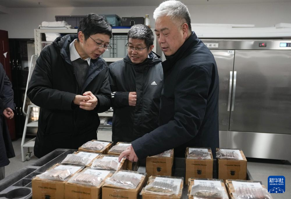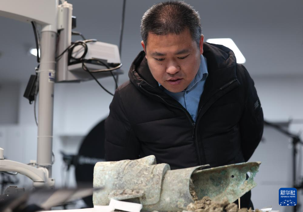 12月16日,在三星堆研究院,考古专家在仔细查看一件青铜面具。