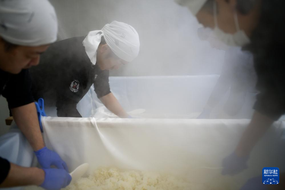 12月17日,在日本福井县常山酒厂,洗好的米被放入蒸笼中蒸熟。