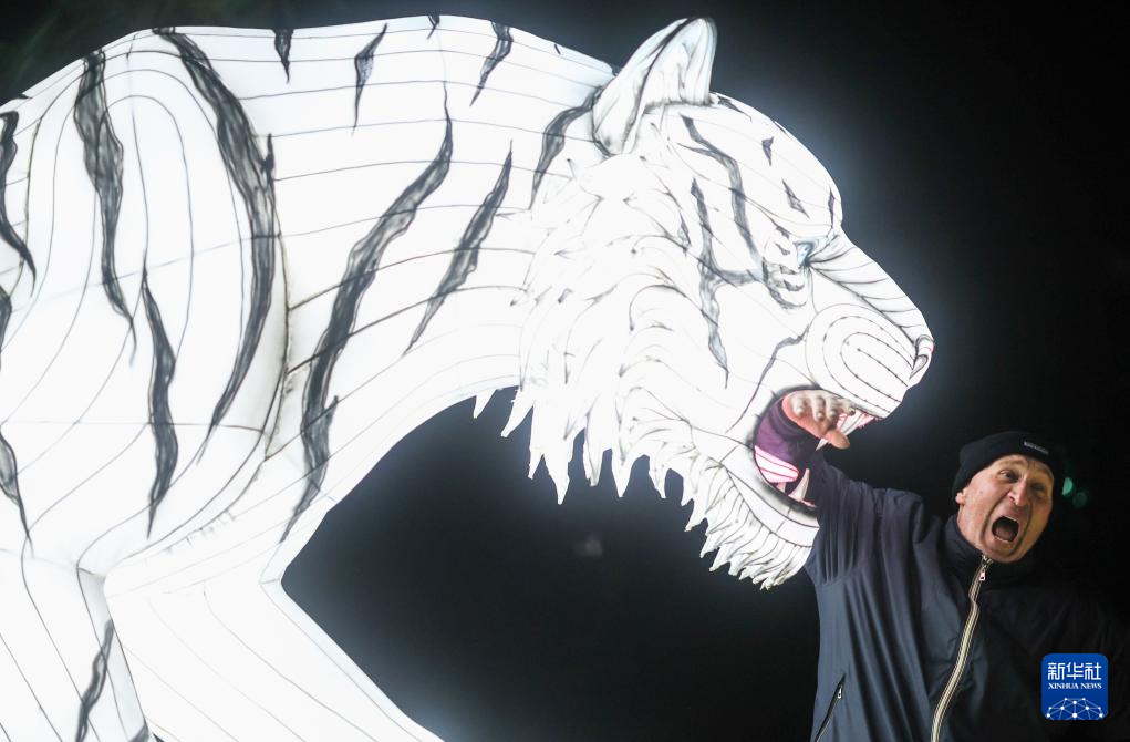 1月6日,在意大利罗马,观众与白虎造型灯饰合影。