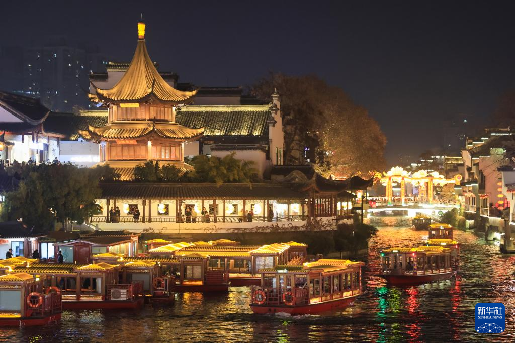 1月21日,游客在南京夫子庙景区乘坐游船赏灯游览。