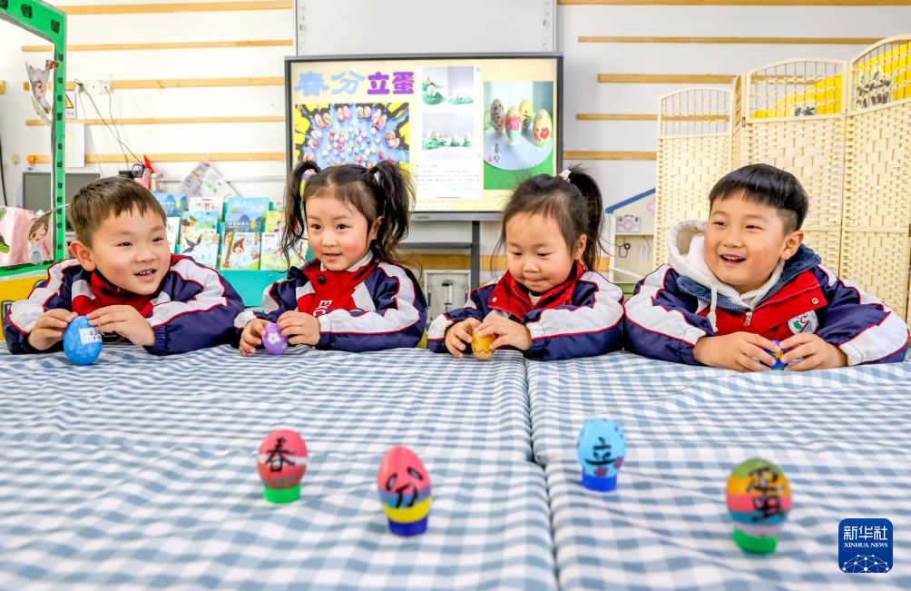 3月20日,在江苏省扬州市江都区育才幼儿园,小朋友们体验“立蛋”习俗。