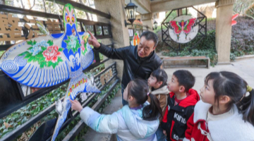 3月24日,府学胡同小学学生向来宾介绍同学们绘制的风筝。