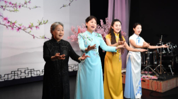 3月24日,府学胡同小学学生在书画摄影展开幕式上表演歌舞。