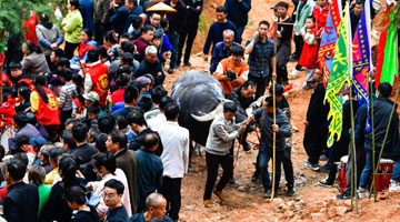 4月9日,在重庆市北碚区水土小学川剧排练室,一名参加川剧变脸演出的孩子在整理头饰。
