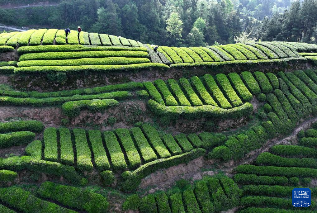 4月14日,在湖北省宣恩县椒园镇中坝社区,茶农在采摘春茶(无人机照片)。